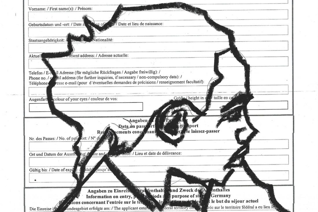 Die kinetische Installation Transit Point ist das zentrale Werk der Ausstellung. Ihre motorisierten Türen, die sich wie von selbst öffnen und schließen, stehen als Metapher für translokale Erfahrungen und gesellschaftliche sowie sprachliche Schwellen. Die Arbeit verwandelt den Raum in ein Panoptikum kontrollierter Bewegungsfreiheit und verweist damit auch auf die Verinnerlichung bürokratischer Überwachung in migrantischen Lebensrealitäten. Eine Gruppe neuer, großformatiger Malereien mit dem Titel In Trail Pursuit verhandelt das Warten als soziale Choreografie – als Moment des Dazwischen, in dem sich Hoffnung, Ausschluss und Zugehörigkeit manifestieren. Sie wird ergänzt durch Selbstporträts aus der Serie Rite of Passage, angefertigt auf Kopien amtlicher Dokumente, die das Gewicht administrativer Verfahren zwischen Identitätserfassung und -zuschreibung verdeutlichen.